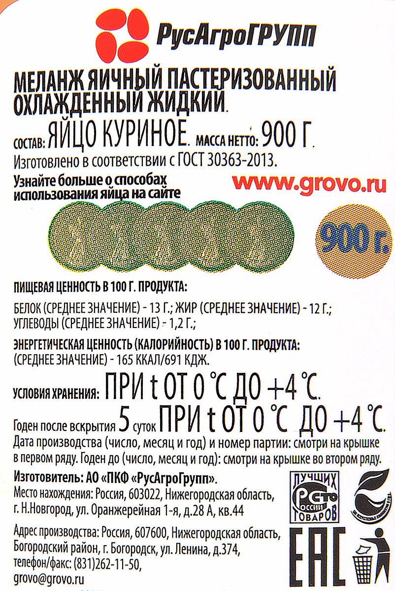 Пастеризованный яичный меланж Grovo - представляет собой однородную смесь белка и желтка в естественном соотношении без посторонних примесей, без осколков скорлупы и плёнок. В охлаждённом состоянии имеет жидкую консистенцию. Готов к употреблению. Отлично подходит для готовки десертов, омлета, кондитерских изделий. Можно употреблять в сыром виде.