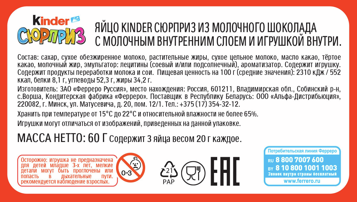 Kinder Сюрприз яйцо из молочного шоколада с белым молочным внутренним слоем, содержащее игрушку-сюрприз. Kinder Сюрприз безусловный лидер на рынке шоколадных яиц с игрушкой сюрпризом и один из самых популярных продуктов среди детских сладостей. Молочный шоколад высокого качества изготовлен специально для детей и содержит много молока.