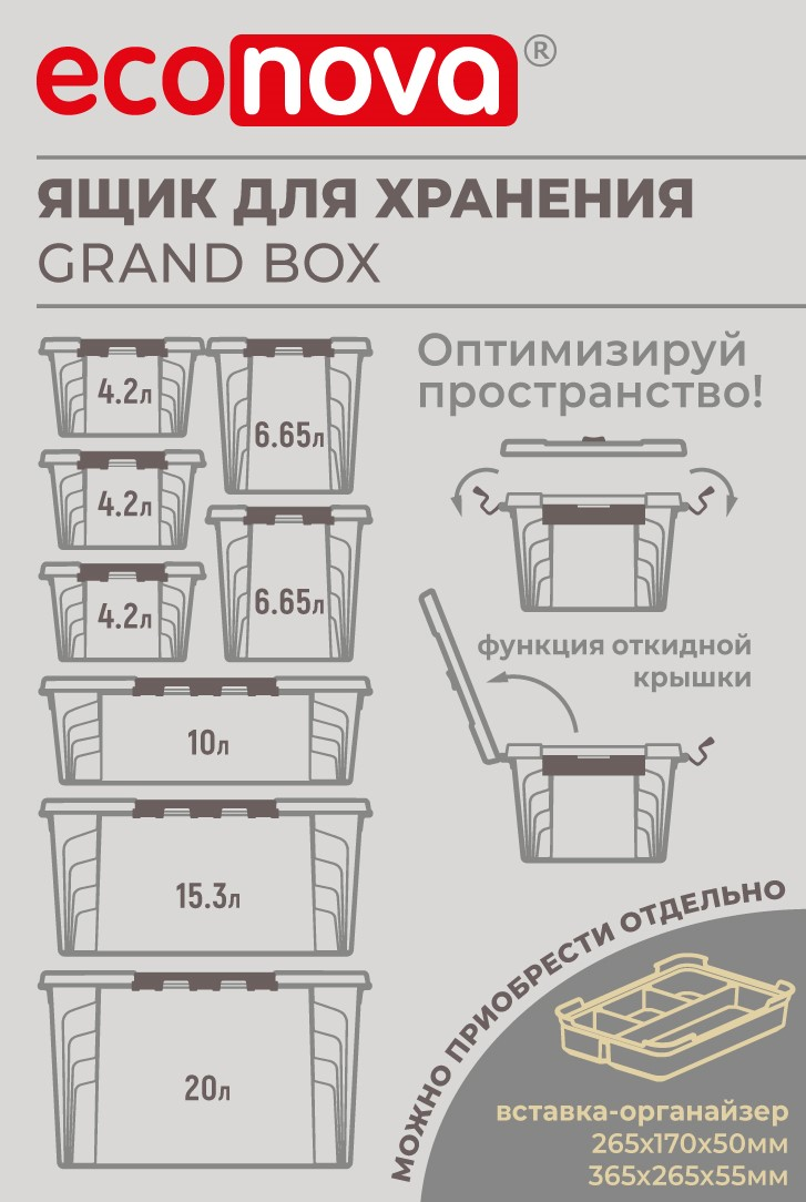 Ящики линейки Grand Box выпускаются в пяти размерах: 4.2л, 6.65л, 10л, 15.3л, 20л. Ящик 20 литра подходит для строительных инструментов, рыболовных снастей, швейных материалов, предметов для хобби и детского творчества, медикаментов, косметики и многого другого. Особая крышка может открываться откидным способом, а может сниматься полностью. Прочная ручка и надёжные замки позволяют спокойно и с удобством брать ящик с собой.