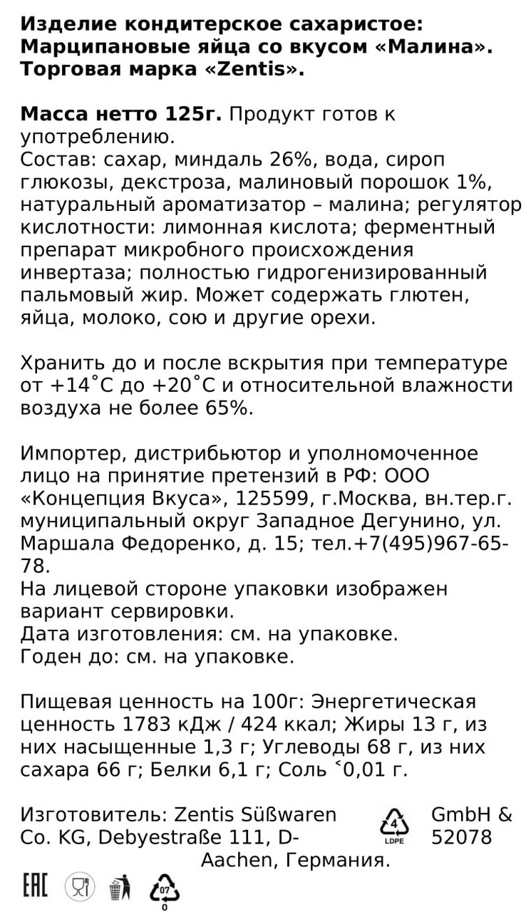 Яйца марципановые Zentis с малиной, 125г