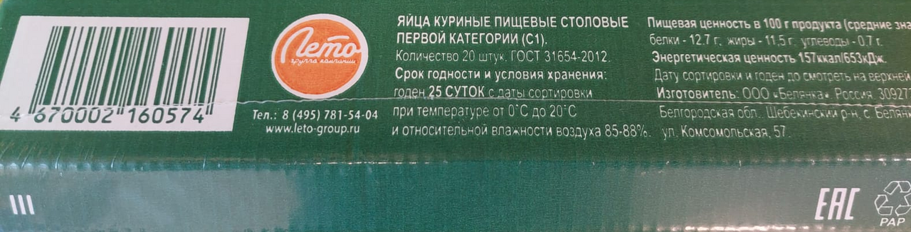 Яйца Лето производят по самым высоким стандартам. Они сочетают в себе пользу и великолепные вкусовые качества. Отборные зерна золотой кукурузы - основа корма курочек, поэтому у яиц Лето самый яркий желток. Перед упаковыванием продукция проходит двойной контроль качества. Экологичный и очень прочный картонный контейнер обеспечивает защиту от повреждений в процессе транспортировки.
