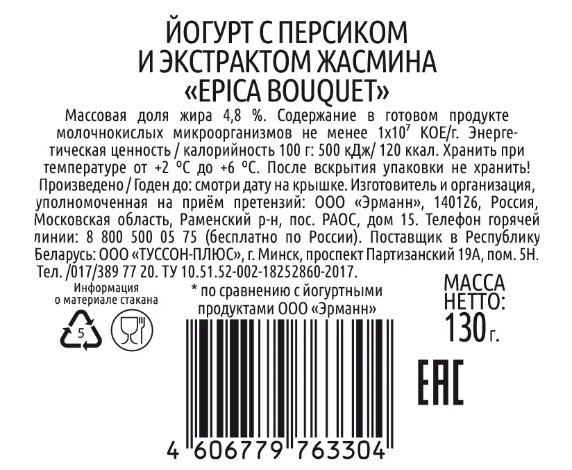 Йогурт Epica Bouquet персик жасмин 4.8%, 130г