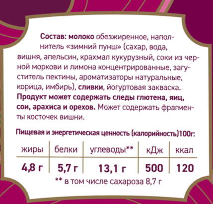 Молоко обезжиренное, наполнитель зимний пунш (сахар, вода, вишня, апельсин, крахмал кукурузный, соки из черной моркови и лимона концентрированные, загуститель пектины, ароматизаторы натуральные, корица, имбирь), сливки, йогуртовая закваска.