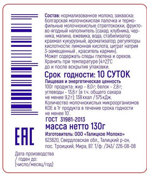 Нормализованные сливки с добавлением закваски: болгарской молочной палочки и термофильных молочных стрептококков, фруктово-ягодный наполнитель для молочных продуктов (сахар, черника, малина, клубника, ежевика, вода, стабилизатор: крахмал; регуляторы кислотности: лимонная кислота, натриевая соль лимонной кислоты, краситель кармин, ароматизатор натуральный).