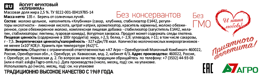 Содержит сочные кусочки ягод. У него нежный бело-розовый цвет, приятный кисломолочный аромат и сладкий клубничный вкус. Подойдет как для завтрака, так и в качестве десерта. В нём отсутствуют красители, стабилизаторы, ароматизаторы и ГМО.