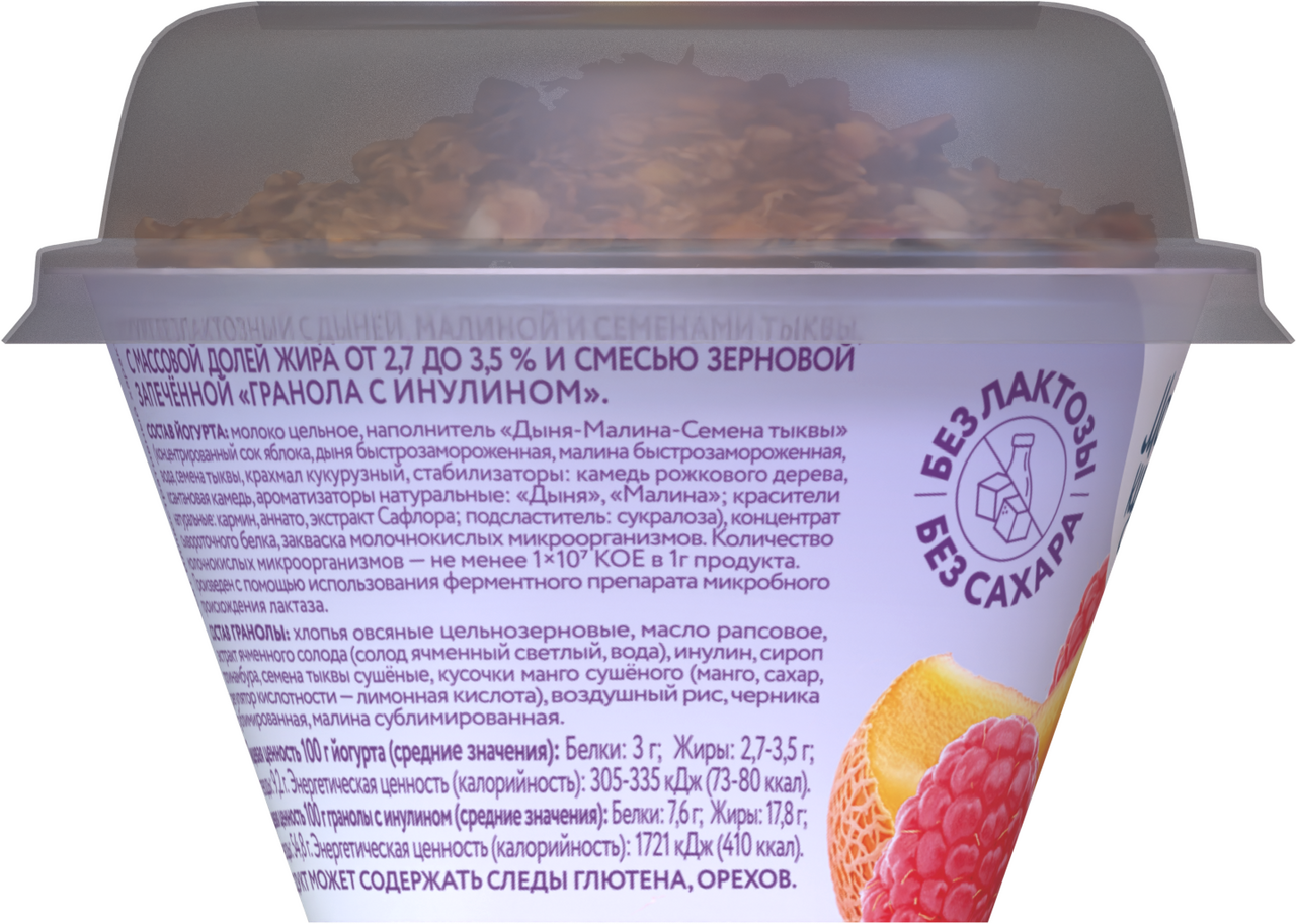 Йогурт: молоко цельное, наполнитель Дыня-Малина-Семена тыквы (концентрированный сок яблока, дыня быстрозамороженная, малина быстрозамороженная, вода, семена тыквы, крахмал кукурузный, стабилизаторы: камедь рожкового дерева, ксантановая камедь; ароматизаторы натуральные: Дыня, Малина; красители натуральные: кармин, аннато, экстракт Сафлора, подсластитель: сукралоза), концентрат сывороточного белка, закваска молочнокислых микроорганизмов; Гранола: хлопья овсяные цельнозерновые, масло рапсовое, экстракт ячменного солода (солод ячменный светлый, вода), инулин, сироп топинамбура, семена тыквы сушеные, кусочки манго сушеного (манго, сахар, регулятор кислотности - лимонная кислота), воздушный рис, черника сублимированная, малина сублимированная.