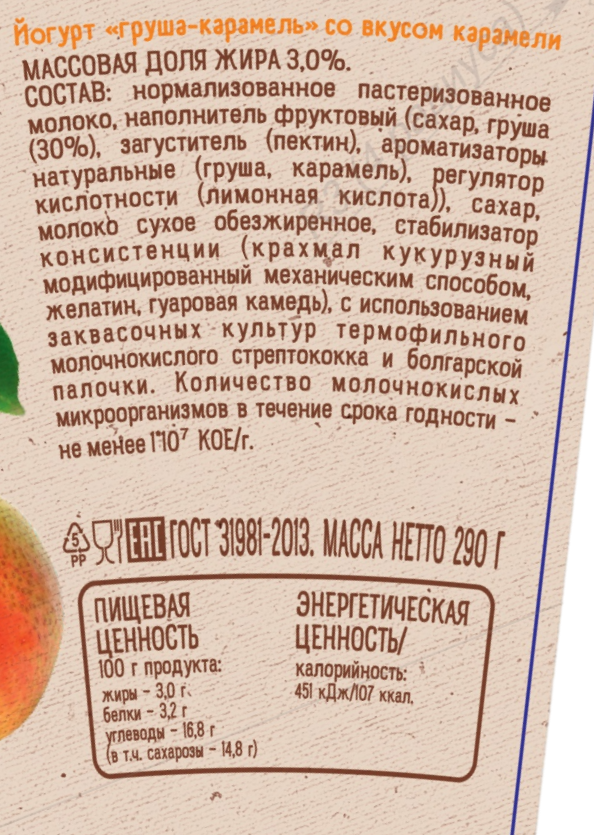 Нормализованное пастеризованное молоко, наполнитель фруктовый сахар, груша 30%, загуститель пектин, ароматизаторы натуральные груша, карамель, регулятор кислотности лимонная кислота, сахар, молоко сухое обезжиренное, стабилизатор консистенции желатин, крахмал кукурузный модифицированный механическим способом, гуаровая камедь, с использованием заквасочниых культур термофильного молочнокислого стрептококка и болгарской палочки.