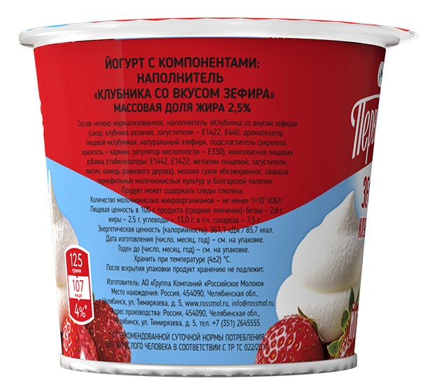 Молоко нормализованное, наполнитель Клубника со вкусом зефира сахар, клубника резаная, загустители - Е1422, Е440, ароматизатор пищевой клубника, натуральный зефир, подсластитель сукралоза, краситель - кармин, регулятор кислотности - Е330, комплексная пищевая добавка стабилизаторы: Е1442, Е1422, желатин пищевой, загустители: пектин, камедь рожкового дерева, молоко сухое обезжиренное, закваска термофильных молочнокислых культур и болгарской палочки.