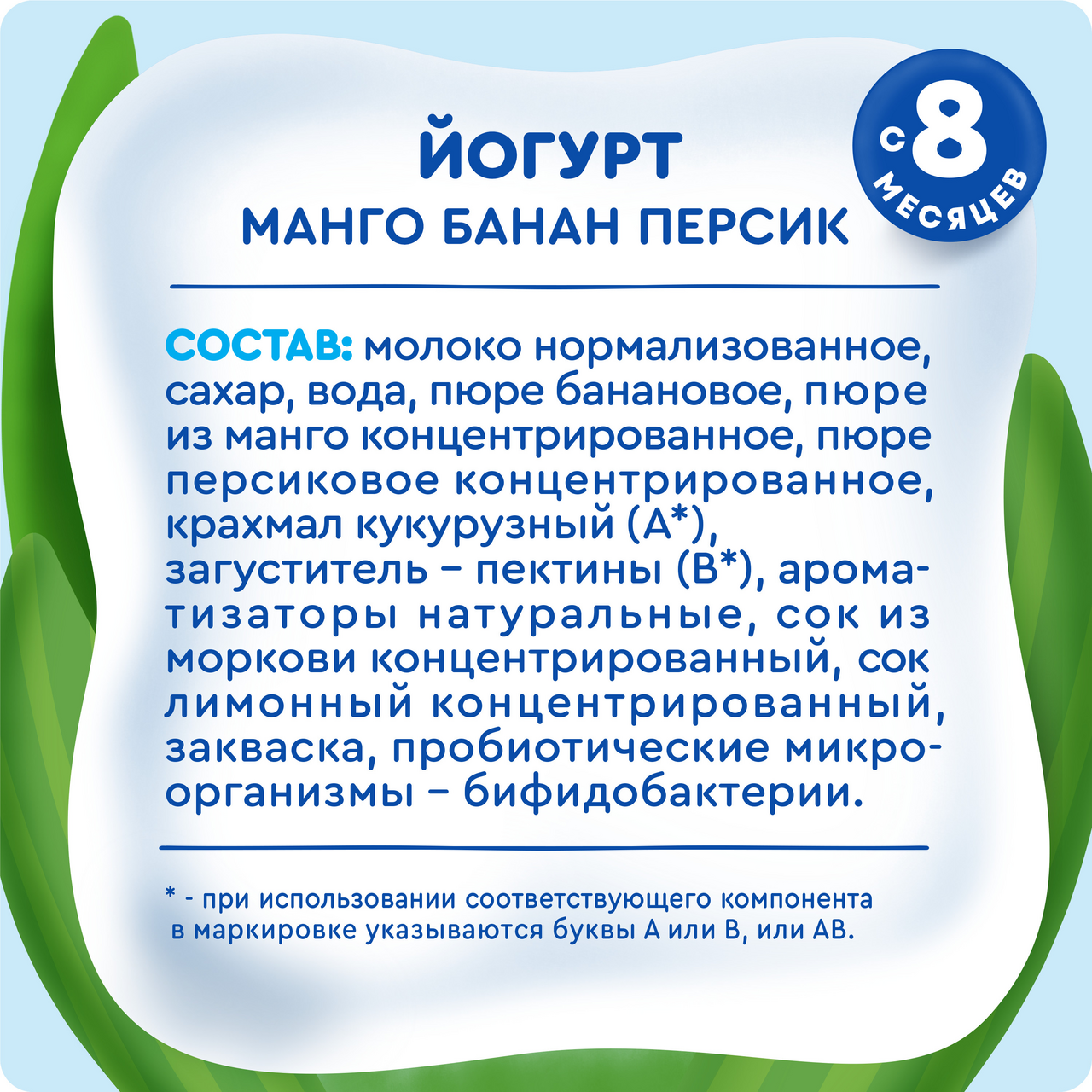 Молоко нормализованное, сахар, вода, пюре банановое, пюре из манго концентрированное, пюре персиковое концентрированное, крахмал кукурузный (А*), загуститель – пектины (В*), ароматизаторы натуральные, сок из моркови концентрированный, сок лимонный концентрированный, закваска, пробиотические микроорганизмы – бифидобактерии. * - при использовании соответствующего компонента в маркировке указываются буквы А или В, или АВ.