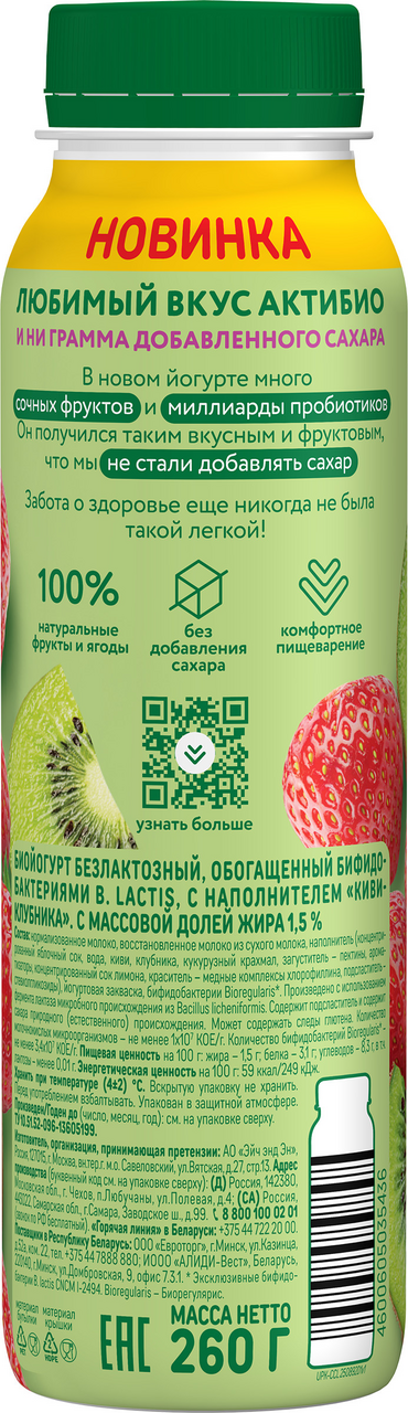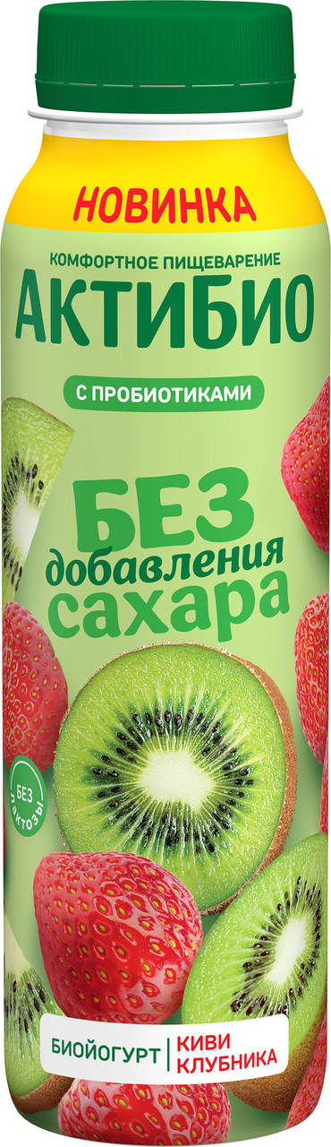 Йогурт питьевой Актибио киви и клубника безлактозный без сахара 1.5%, 260г