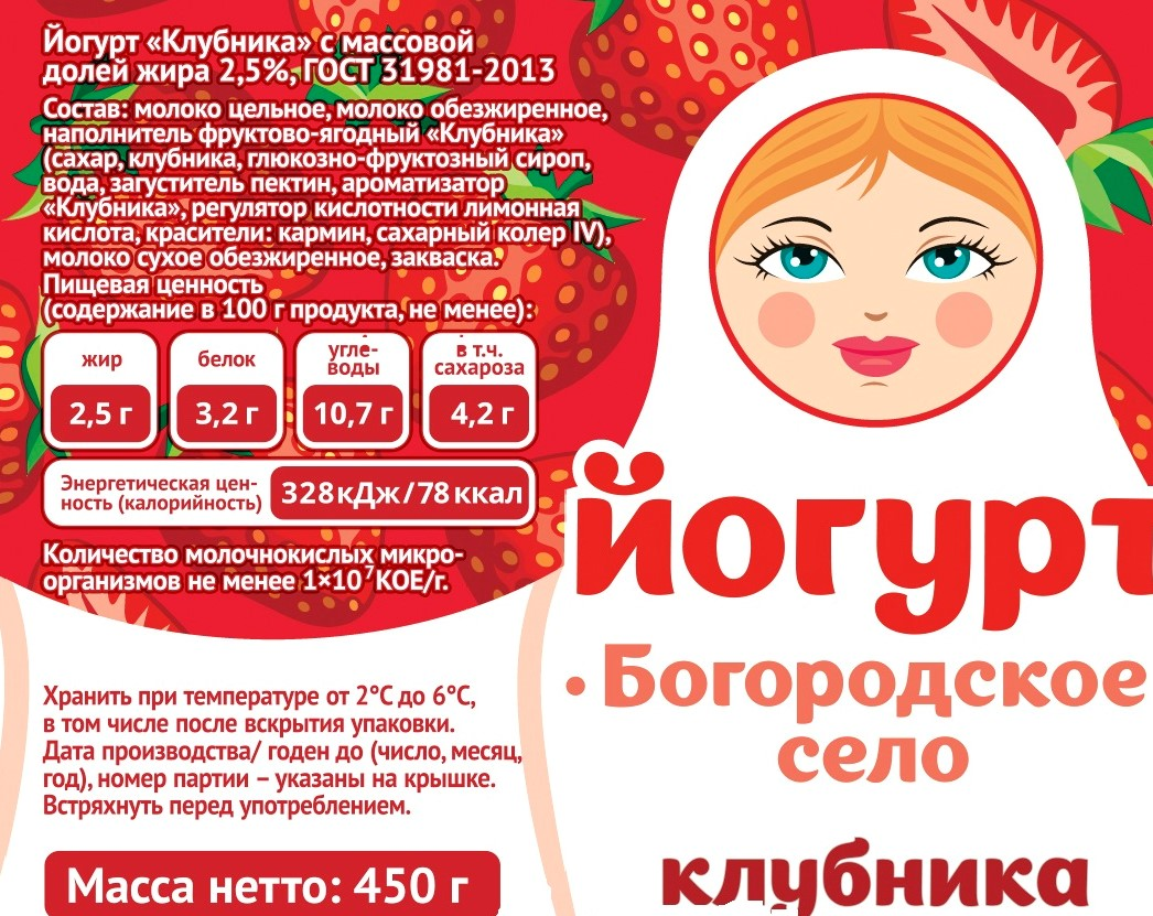 Молоко цельное, молоко обезжиренное, наполнитель фруктово-ягодный Клубника (сахар, клубника, глюкозно-фруктовый сироп, вода, загуститель пектин, ароматизатор Клубника, регулятор кислотности: лимонная кислота, красители: кармин, сахарный колер IV), молоко сухое обезжиренное, закваска.