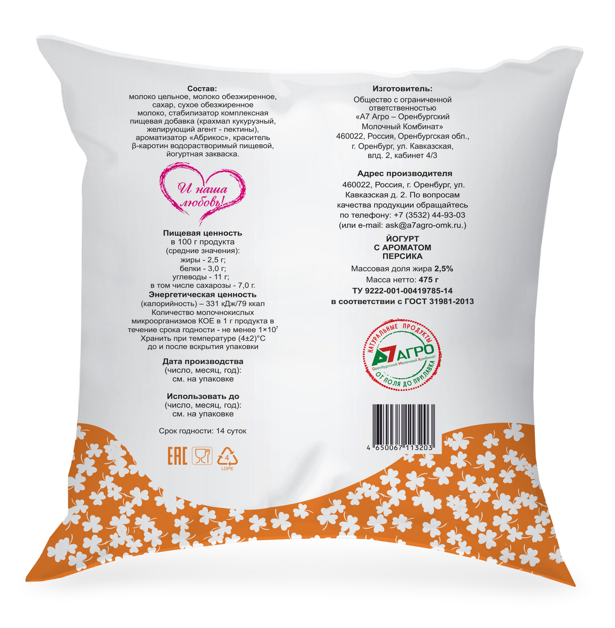 Молоко цельное, молоко обезжиренное, сахар, cухое обезжиренное молоко, стабилизатор комплексная пищевая добавка (крахмал кукурузный, желирующий агент – пектины), ароматизатор Абрикос, краситель каротин водорастворимый пищевой, йогуртная закваска.