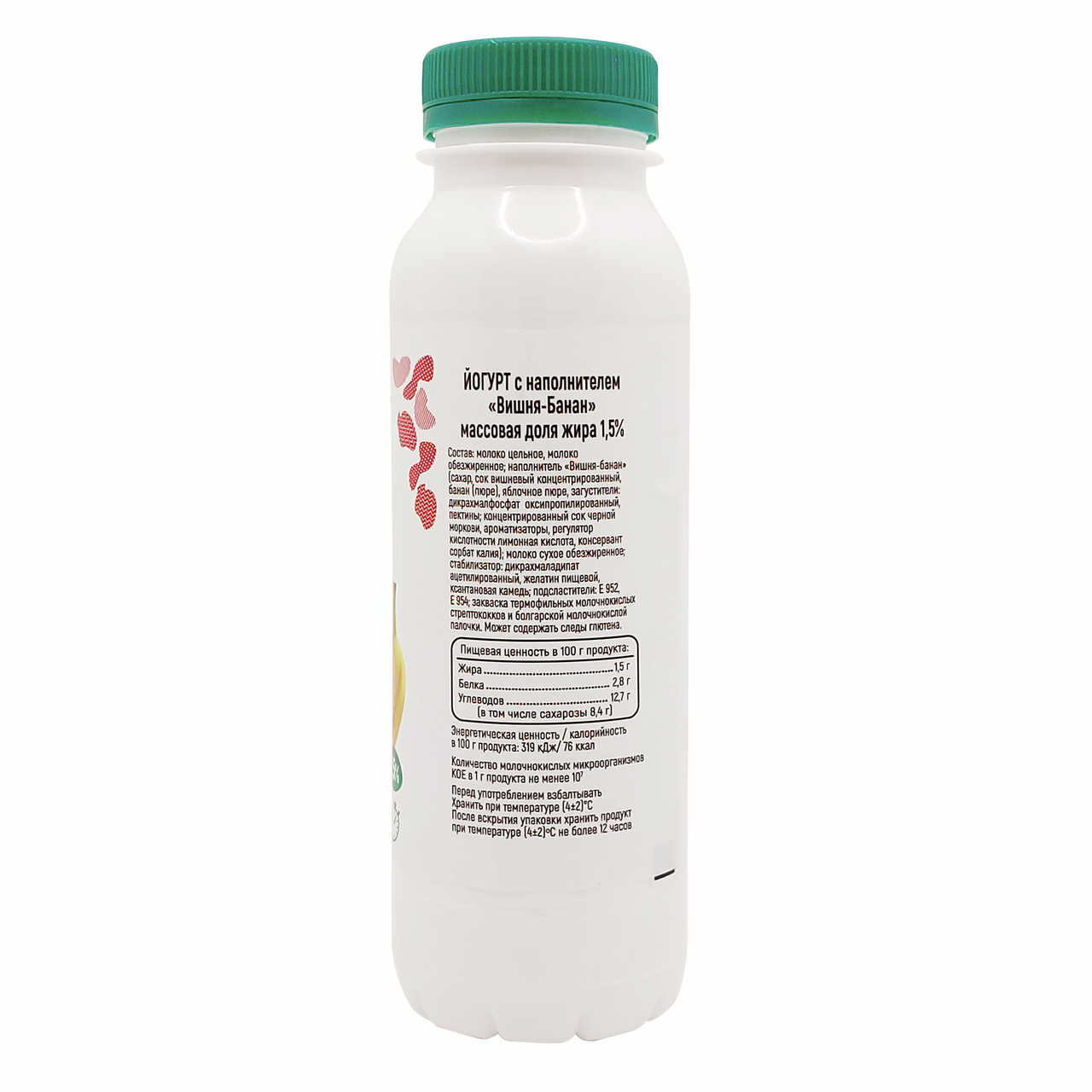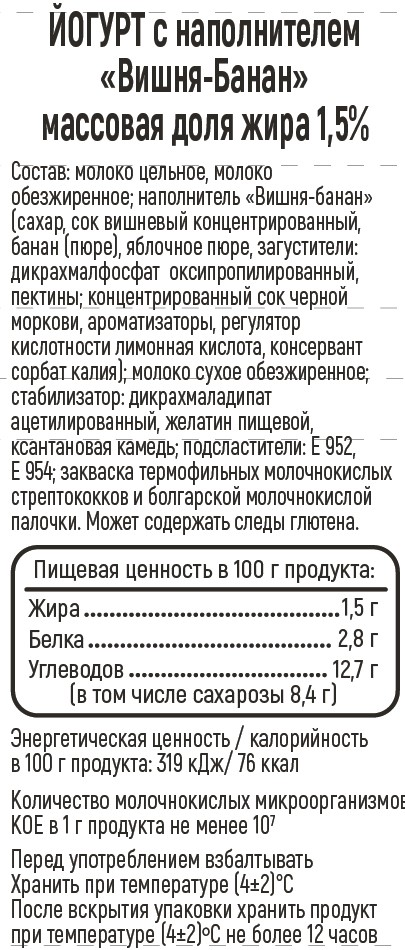 Молоко цельное, молоко обезжиренное, наполнитель Вишня-банан (сахар, сок вишневый концентрированный, банан (пюре), яблочное пюре, загустители: дикрахмалфосфат оксипропилированный, пектины, концентрированный сок черной моркови, ароматизаторы, регулятор кислотности лимонная кислота, консервант сорбат калия), молоко сухое обезжиренное, стабилизатор: дикрахмаладипат ацетилированный, желатин пищевой, ксантановая камедь, подсластители: E 952, E 954, закваска термофильных молочнокислых стрептококков и болгарской молочнокислой палочки.