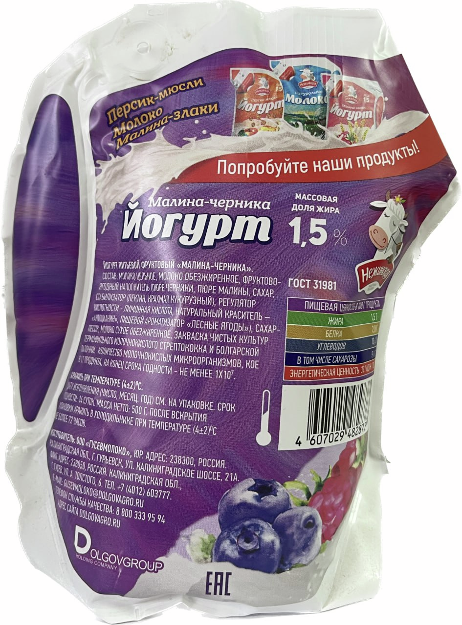 Получен из молока, подвергнутого пастеризации, однородный, вязкий кисломолочный напиток с ягодным наполнителем со вкусом малины и черники, равномерный по массе. Рецептура йогурта имеет абсолютно натуральный состав, которая делает его вкусным. легкий напиток, который пользуется одинаково высокой популярностью как у детей, так и у взрослых. Йогурт сочетает пользу кисломолочной закваски и яркий вкус малины и черники.