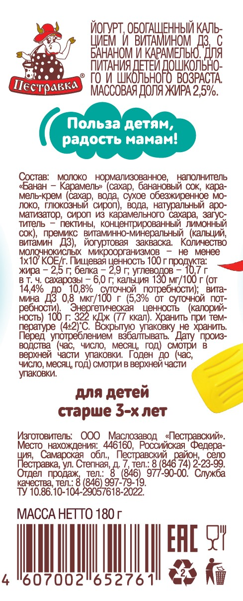 Йогурт питьевой Пестравка детям банан-карамель, 180г