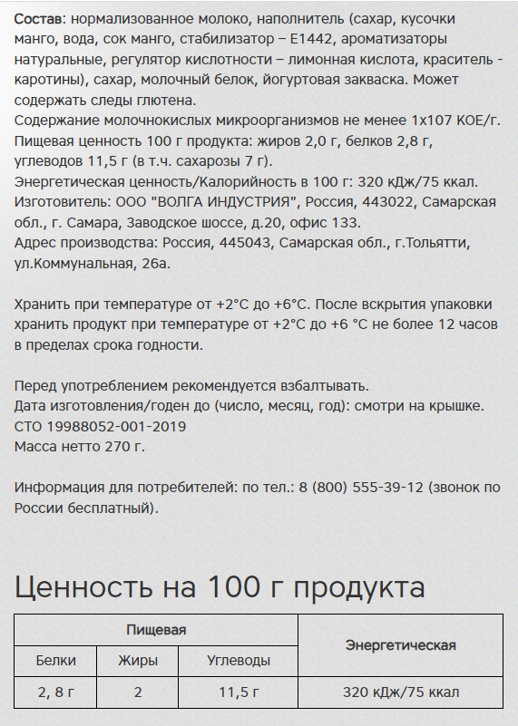 Молоко обезжиренное, сливки, наполнитель (сахар, кусочки манго, вода, сок манго, стабилизатор – Е1442, ароматизаторы натуральные, регуляторы кислотности: лимонная кислота, Е331(iii); краситель - каротины), сахар, молочный белок, йогуртовая закваска.