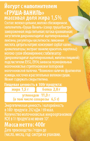 Молоко цельное , молоко обезжиренное, наполнитель Груша-Ваниль (сахар; груша быстрозамороженная; вода питьевая; патока крахмальная; загустители дикрахмаладипат ацетилированный, пектины; регулятор кислотности : лимонная кислота, цитраты натрия; консервант сорбат калия; ароматизаторы; экстракт ванили; краситель каротины); молоко сухое обезжиренное, стабилизатор (дикрахмаладипат ацетилированный, желатин пищевой); подсластители: Е952, Е954; закваска термофильных молочнокислых стрептококков и болгарской молочной палочки.