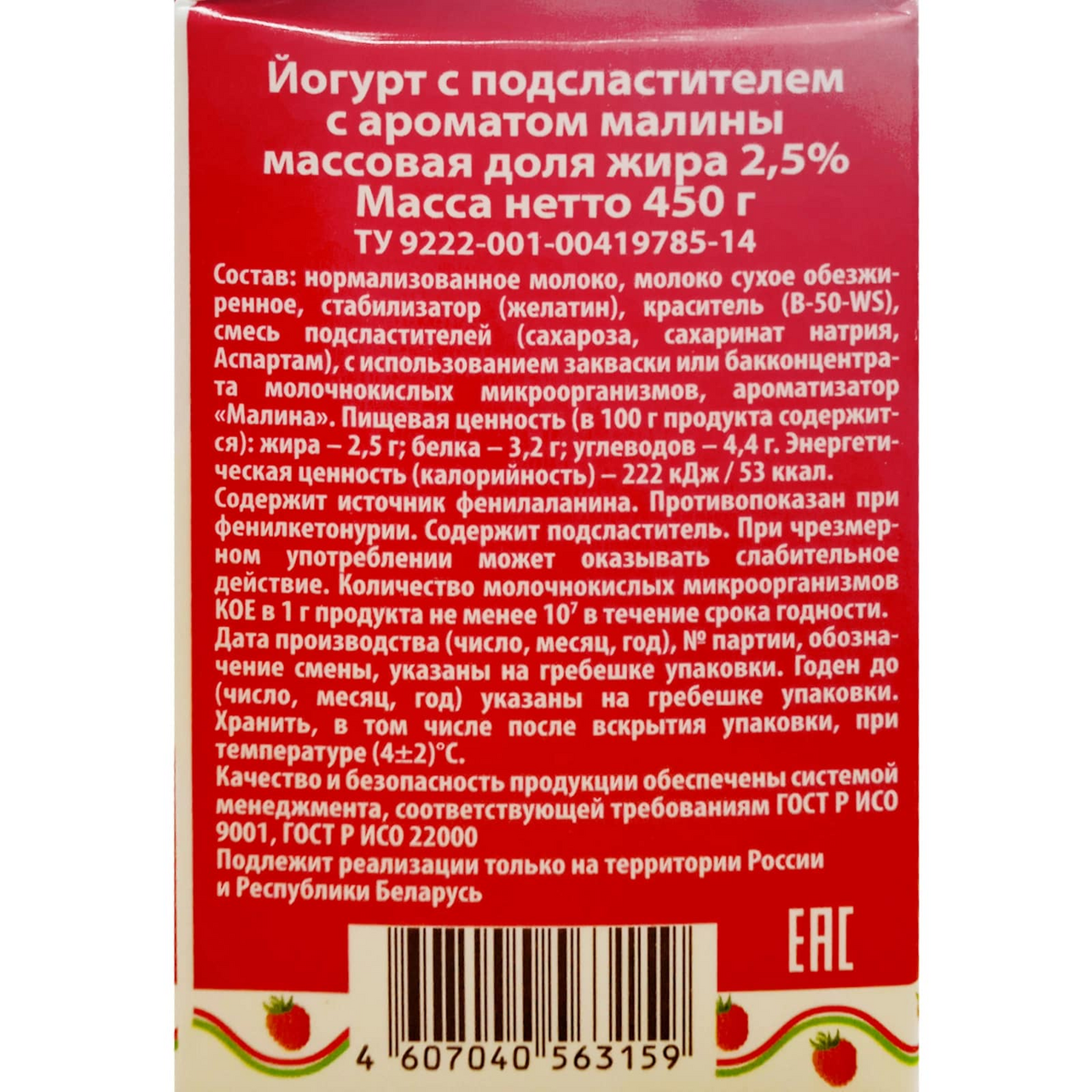 Нормализованное молоко, молоко сухое обезжиренное, стабилизатор (желатин), краситель (В-50-w), смесь подсластителей (сахароза, сахаринат натрия, Аспартам), с использованием закваски или ьакконцентрата молочнокислых микроорганизмов, ароматизатор Малина.