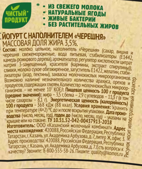 Молоко цельное, наполнитель Черешня сахар, вишня и черешня свежемороженые, вода питьевая, стабилизаторы Е1442, камедь рожкового дерева, ароматизатор, регулятор кислотности цитрат натрия 3-замещенный, красители кармины, экстракт спирулины, сливки, молоко сухое обезжиренное, загуститель Е1422, желатин, стабилизаторы агар, пектины, закваска молочнокислых микроорганизмов.