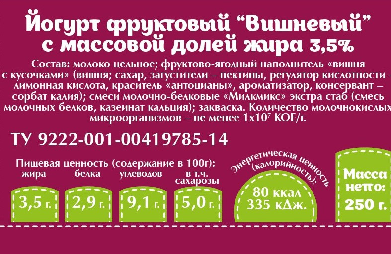 Молоко цельное; фруктово-ягодный наполнитель вишня с кусочками (вишня; сахар, загустители - пектины, регулятор кислотности - лимонная кислота, краситель антоцианы, ароматизатор, консервант - сорбат калия); смеси молочно-белковые Милкмикс экстра стаб (смесь молочных белков, казеинат кальция); закваска.