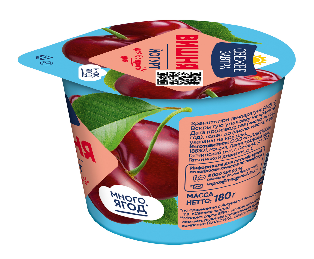Много ягод и много фруктов - линейка густых йогуртов с натуральными ягодами и фруктами в составе. Йогурты созданы из молока сорта Elite, с высоким содержанием целых ягод и больших кусочков фруктов. В линейке много ягод и много фруктов использованы простые и только натуральные ингредиенты, в составе нет Е компонентов. Вкуснейший безглютеновый продукт, произведенный по концепции чистая этикетка без использования Е-добавок. В его состав входят только простые и понятные ингредиенты: высококачественное молоко с российских молочных хозяйств, сахар, вишневый наполнитель и закваска. Продукт служит источником полезных живых бактерий, которые благотворно влияют на микрофлору кишечника и повышают иммунитет. Благодаря натуральной рецептуре и низкой калорийности он отлично подойдет для приверженцев здорового питания.