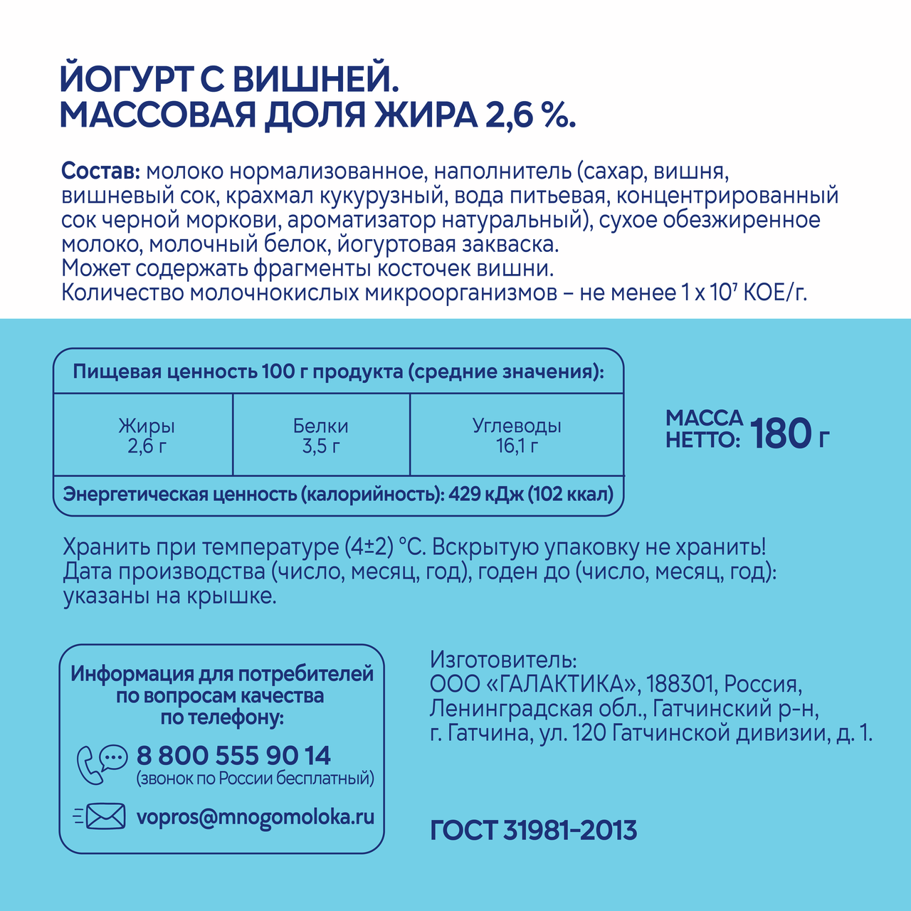 Молоко нормализованное, наполнитель сахар, вишня, вишневый сок, вода питьевая, крахмал кукурузный, концентрированный сок черной моркови, ароматизатор натуральный, сухое обезжиренное молоко, молочный белок, йогуртовая закваска.