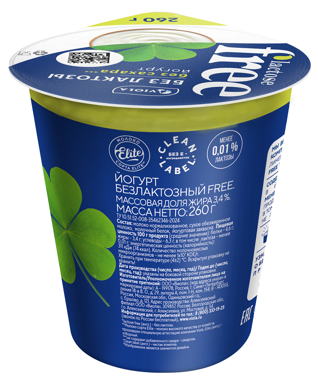 Йогурт Viola безлактозный без сахара 3.4%, 260г