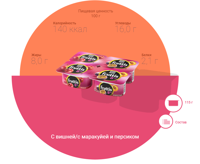 Йогуртный продукт Fruttis C вишней/с маракуйей и персиком 8%, 115г