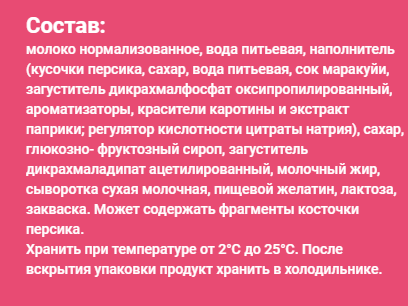 Молоко обезжиренное, молоко цельное, сахар, наполнитель Вишня-Черная смородина (фруктовая часть: вишня, черная смородина; патока кукурузная, сахар, вода, загуститель крахмал кукурузный модифицированный Е 1442, регуляторы кислотности: лимонная кислота, цитрат натрия, ароматизаторы: вишня, черная смородина, краситель — антоцианы), комплексная пищевая добавка (стабилизаторы: модифицированный крахмал Е 1422, желатин, пектин), молоко сухое обезжиренное, закваска.