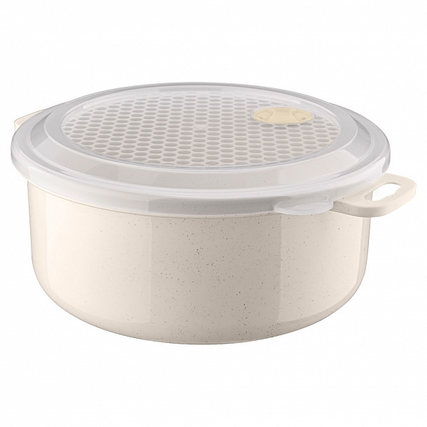 Емкость можно использовать для хранения продуктов в холодильнике, а также для разогревания пищи в микроволновой печи. В микроволновой печи можно использовать, не снимая крышки (при открытом клапане), что ускоряет процесс и предохраняет внутреннюю поверхность микроволновой печи от загрязнения. Клапан для выпуска пара имеет два положения: открыт/закрыт. Прозрачная крышка позволяет следить за процессом приготовления пищи. Емкость имеет удобные ручки.