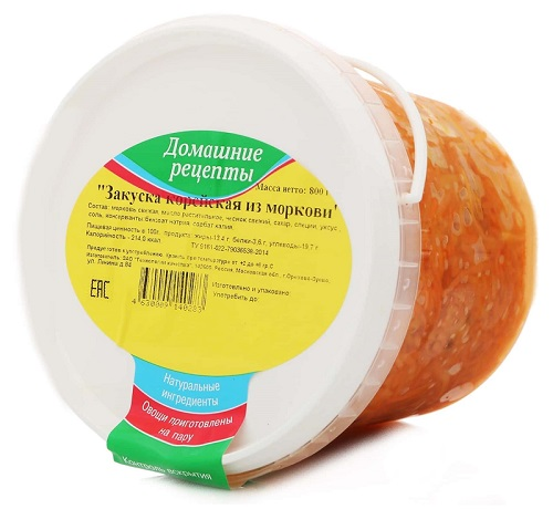 Состав: Морковь свежая, масло растительное, чеснок свежий, сахар, специи, уксус, соль, консерванты: бензоат натрия, сорбат калия. Условия хранения: При температуре от +2С до +6ССрок годности: 10 суток