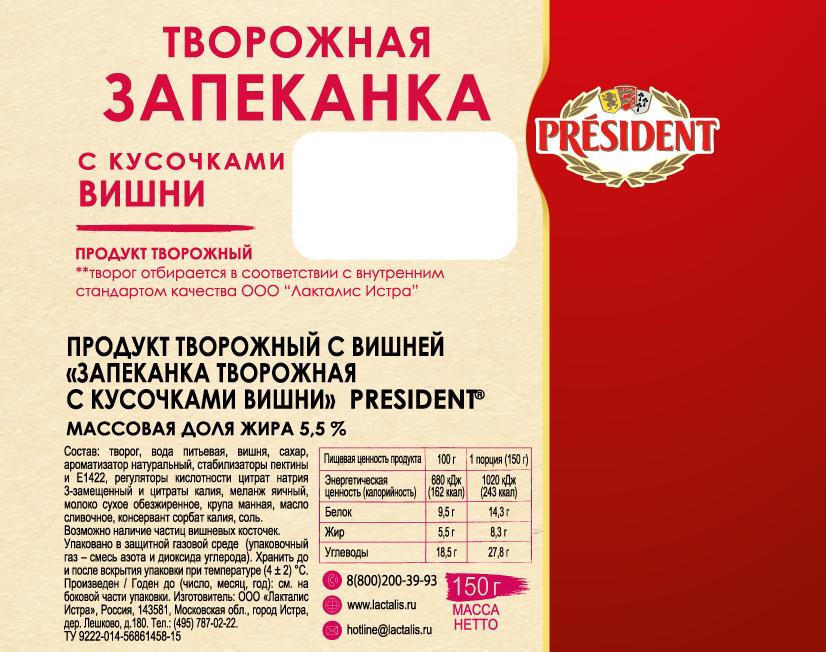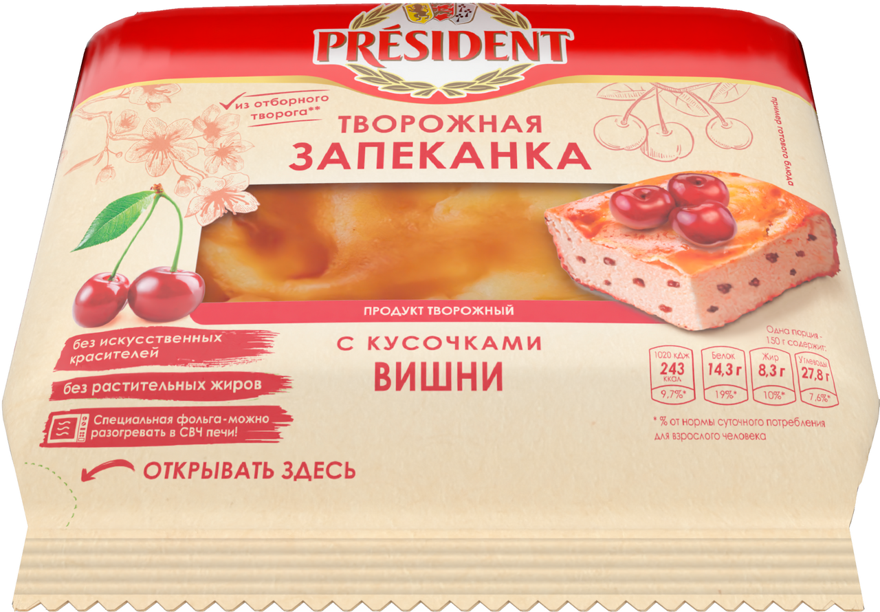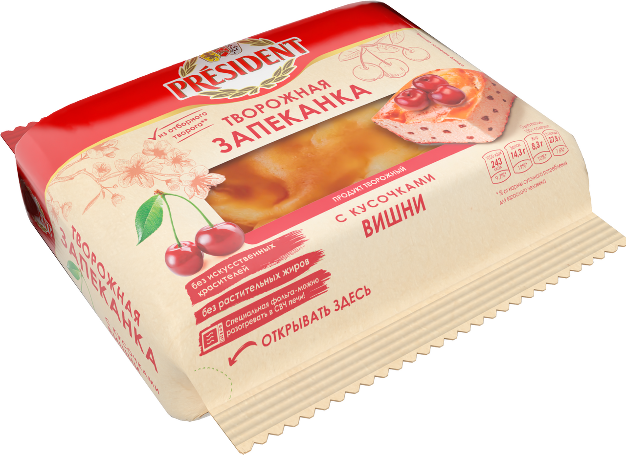 Творог, вода питьевая, вишня, сахар, ароматизатор натуральный, стабилизаторы пектины и Е1422, регуляторы кислотности цитрат натрия 3-замещенный и цитраты калия, меланж яичный, молоко сухое обезжиренное, крупа манная, масло сливочное, консервант сорбат калия, соль. Возможно наличие частиц вишневых косточек.