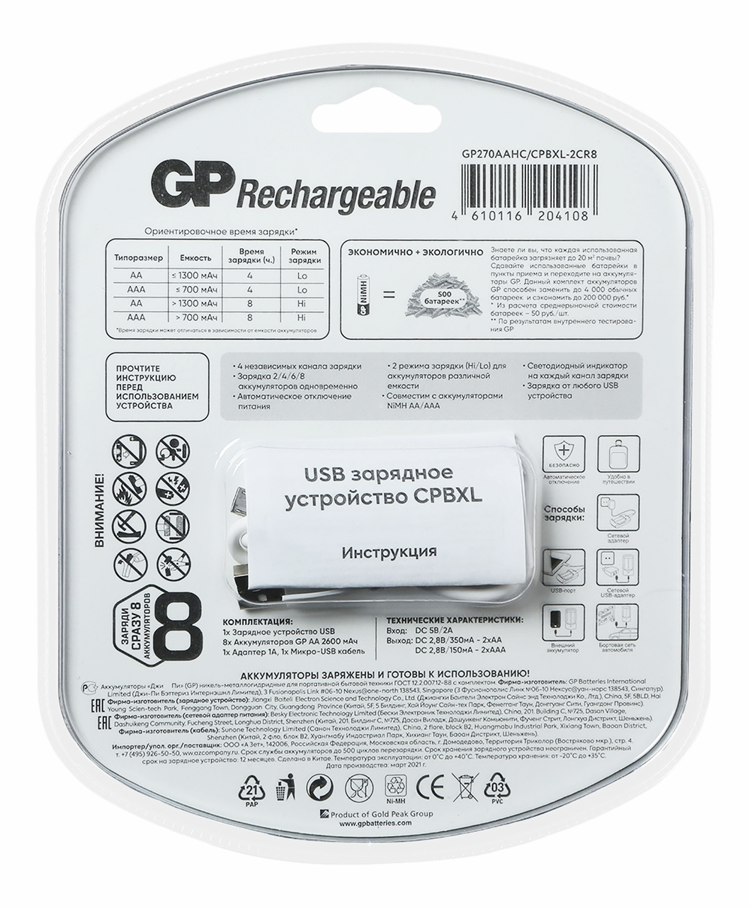 Представьте, что вам нужно одновременно зарядить аккумуляторы для видеоняни, радиоуправляемого вертолета, вибромассажера и беспроводной клавиатуры... Да, в большой семье порой возникают неразрешимые задачи! Без паники: зарядное устройство GP 270AAHC/CPBXL-2CR8 сэкономит родителям массу времени и сил и избавит от регулярных затрат на запасные батарейки. И никто не расстроится от того, что не работает любимая игрушка. А главное, не нужно планировать, что и в каком порядке вам заряжать! Работает везде, где есть USB. Универсальный USB-адаптер позволяет решать ваши задачи даже там, где нет розетки — например, в автомобиле или аэроэкспрессе. Много. Быстро. Эффективно. До 8 полностью заряженных аккумуляторов за 8-10 часов. Идеальный вариант для дома, где много мощных детских игрушек или других устройств. Все включено для разных типоразмеров одновременно. 4-канальная система зарядки позволяет одновременно заряжать 2, 4, 6 или 8 аккумуляторов типов АА или ААА. Два режима — быстрый и медленный. В режиме Lo аккумуляторы ёмкостью меньше или равно 1300 мАч (1.2В) для АА и меньше или равно 700 мАч (1.2В) для ААА зарядятся за 4 часа. Режим Hi зарядит аккумуляторы ёмкостью больше 1300 (1.2В) мАч для АА и больше 700 (1.2В) мАч для ААА за 8 часов. Контроль безопасности. Переключатель выбора емкости предотвращает перезарядку и перегрев. Все аккумуляторы в безопасности! Суперэкономично. Одна из самых доступных моделей с такими характеристиками. U811 делает пользование аккумуляторами удобным. При этом каждая пара аккумуляторов зам��няет до 500 пар обычных батареек — а значит, экономит до 100 тысяч рублей! Забота о вас и о планете. Одноразовые батарейки — опасный отход: попадая в природу, они отравляют тяжелыми металлами почву и грунтовые воды. Используя аккумуляторы, вы снижаете нагрузку на окружающую среду в несколько сотен раз.