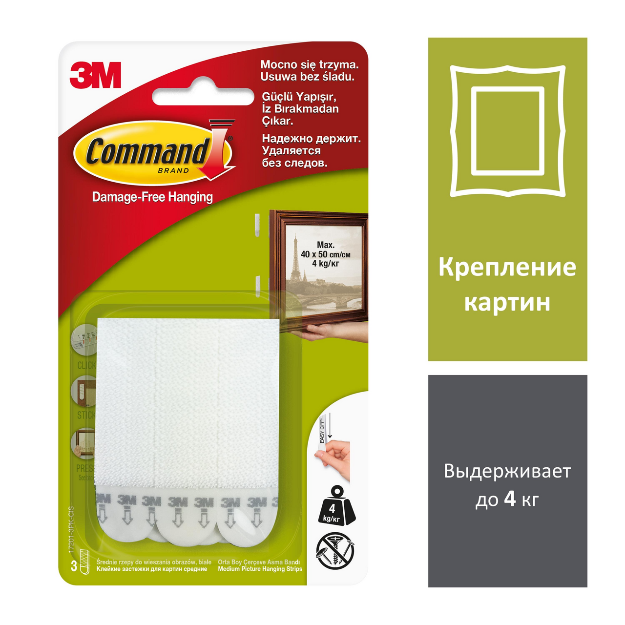Command™ - это уникальная адгезивная технология для легкого, надежного и безопасного крепления разнообразных аксессуаров на вертикальной поверхности.Данная система позволяет организовать пространство Инструменты не требуются и не повреждая поверхности. При необходимости можно удалить, потянув за клейкую полоску. Благодаря настенным застежкам Command™ любое помещение легко декорируется картинами и плакатами. Все изображения, зафиксированные настенными застежками, легко заменяются, т.к. при снятии картины нет необходимости удалять с поверхности сам крепеж. Одна застежка фиксируется на стене, а другая - на раме. Именно поэтому Вы можете вешать и снимать Ваши фотографии и другие малые декоративные предметы так часто, как пожелаете.Максимальная нагрузка: 4 кг на упаковку.Для рамок и картин, настенных часов, домофонов, роутеров.Легко крепится.Держит крепко.Удаляется без следа.Инструменты не требуются.