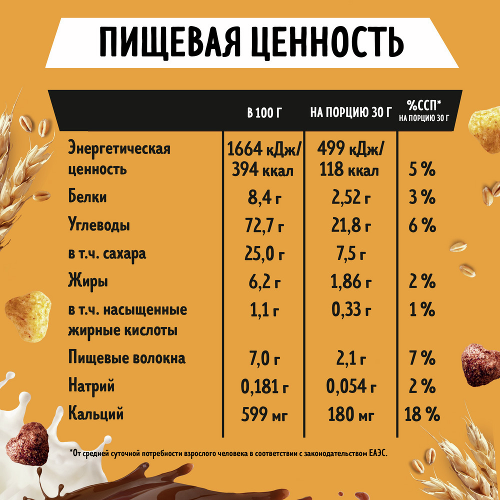 Пшеница (содержит глютен), пшеничная мука (содержит глютен), сахар, патока, масло подсолнечное, карбонат кальция, какао-порошок с повышенным содержанием жира, молоко сухое цельное, какао тёртое, соль, ароматизаторы натуральные, карамельный сироп, эмульгатор (лецитины).