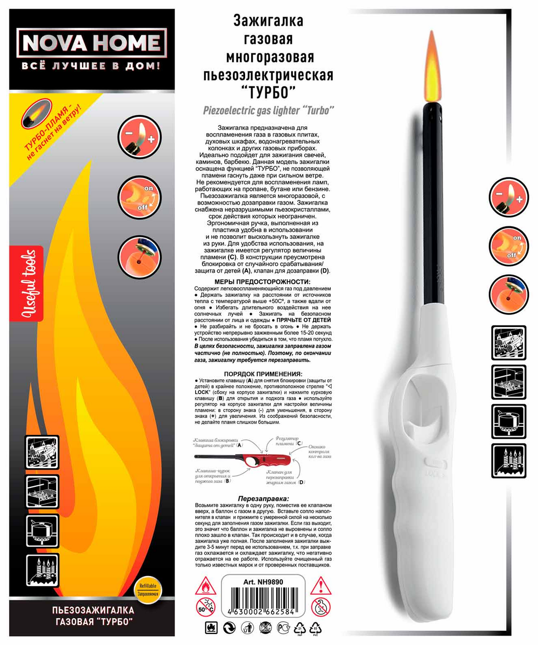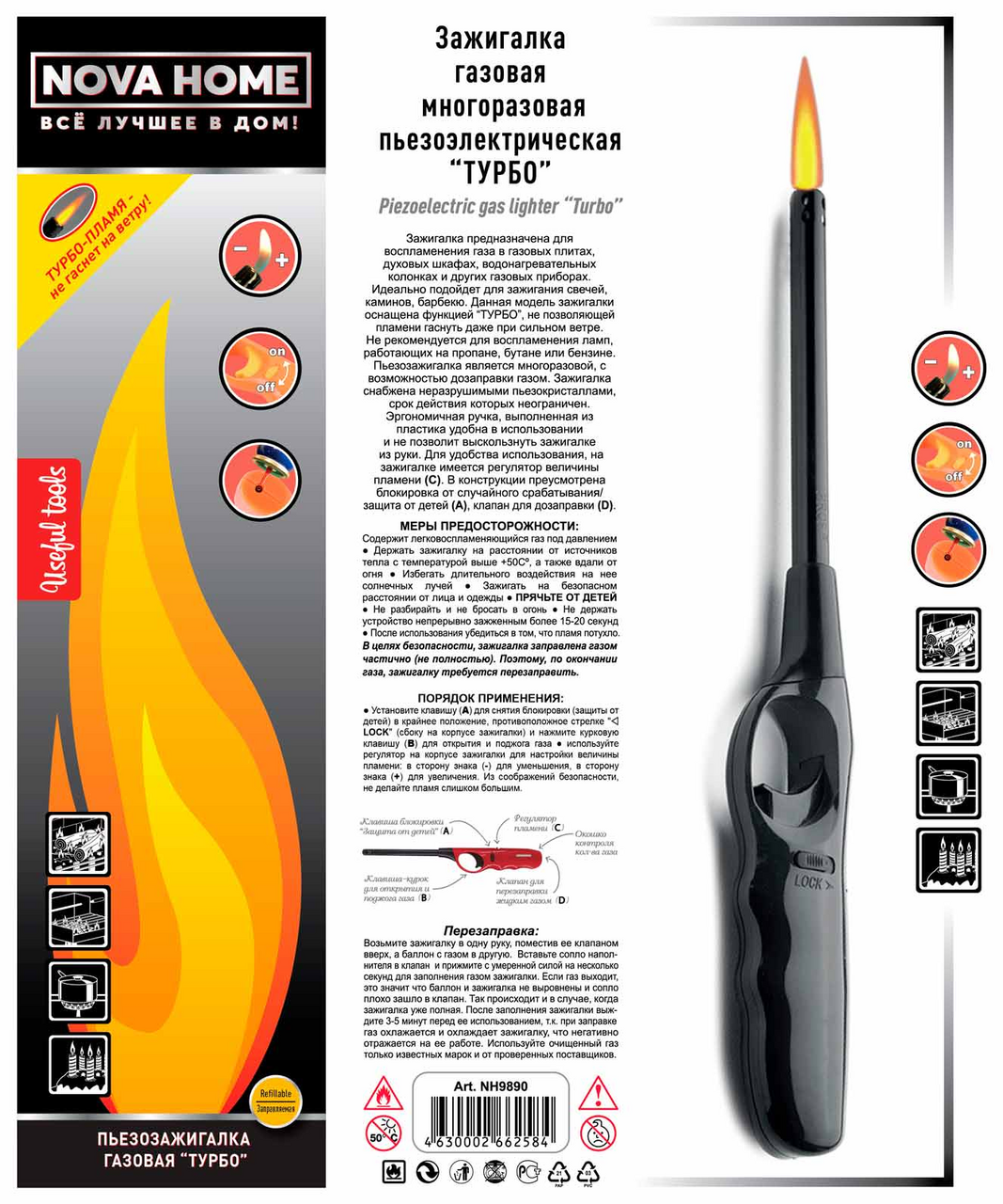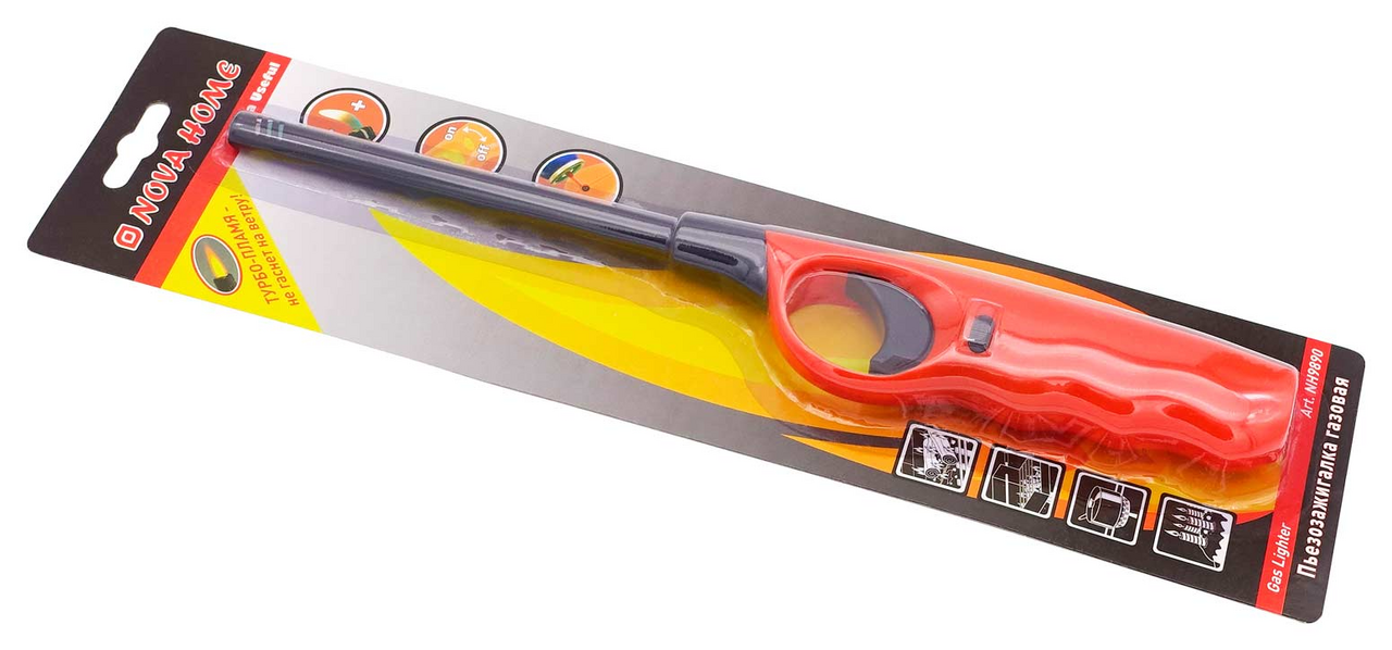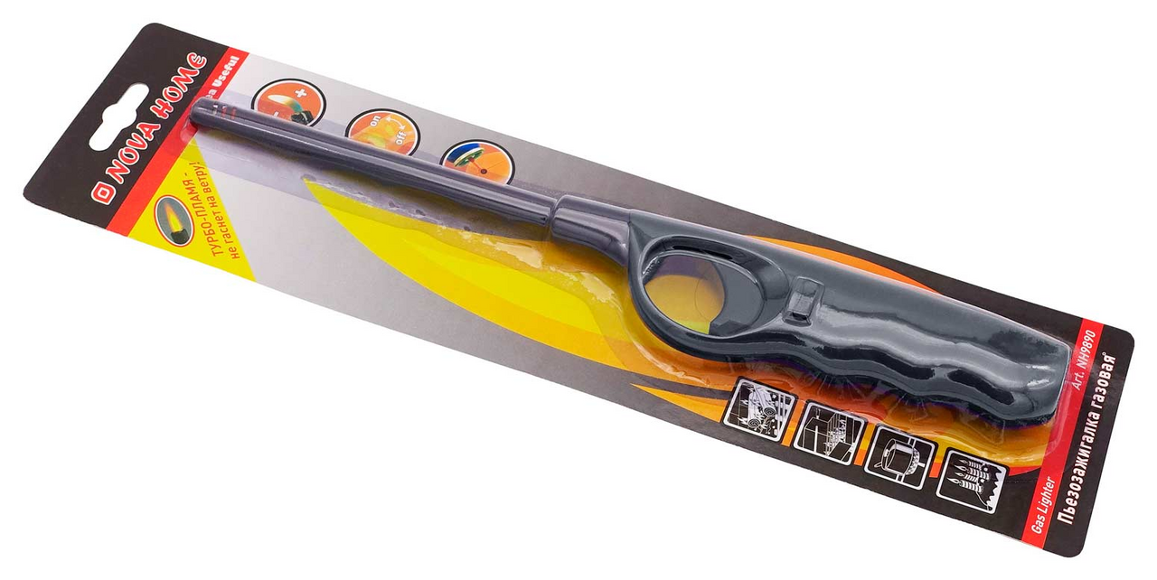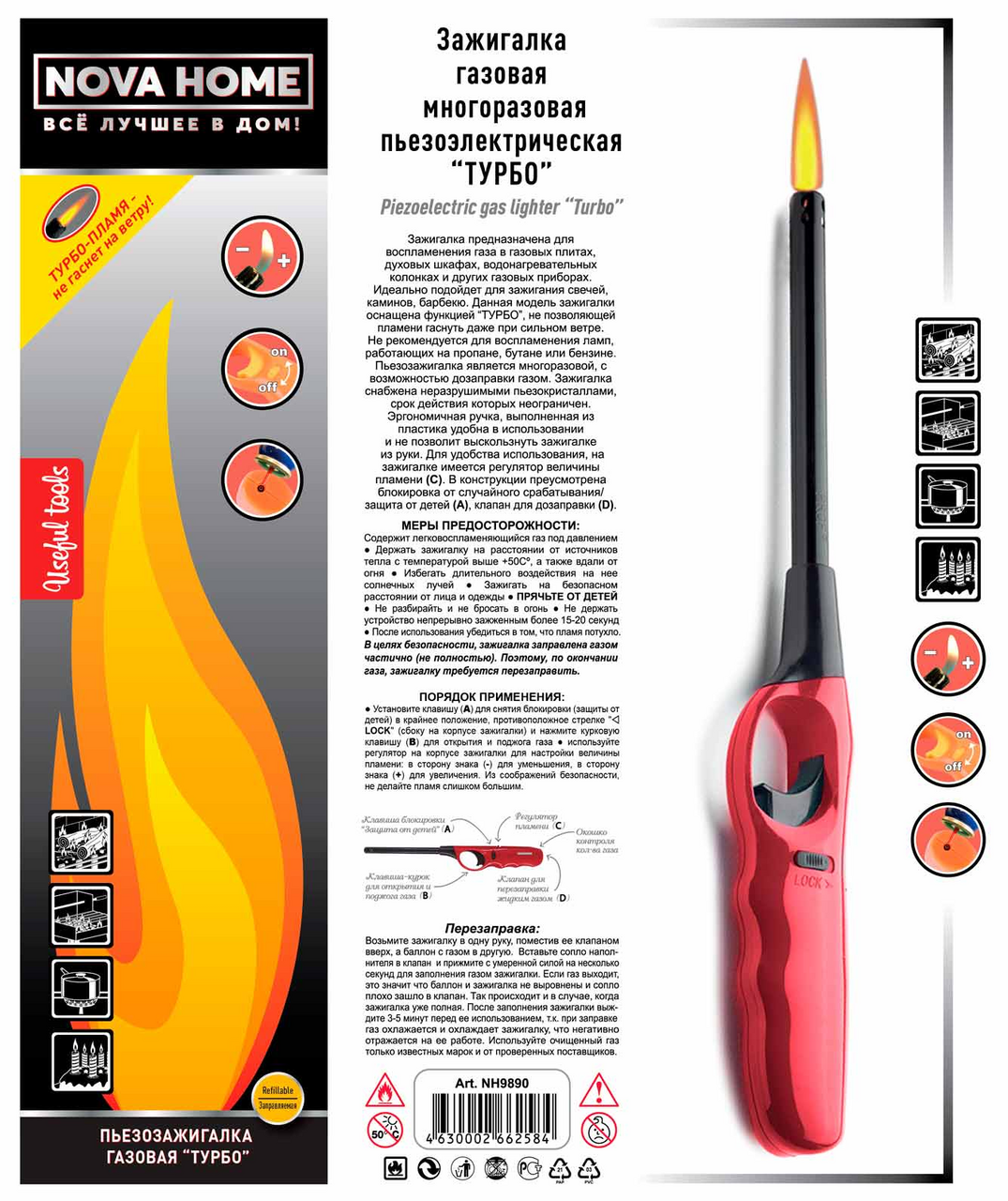 Зажигалка Nova Home с турбонаддувом предназначена для воспламенения газа в газовых плитах, духовых шкафах, водонагревательных колонках и других газовых приборах. Идеально подойдет для зажигания свечей, каминов, барбекю. Данная модель зажигалки оснащена гибкой трубкой, что в определенных случаях значительно облегчает ее использование. Не рекомендуется для воспламенения ламп, работающих на пропане, бутане или бензине. Пьезозажигалк�� является многоразовой, с возможностью дозаправки газом. Благодаря турбонаддуву газа пламя, которое дает зажигалка, остается стабильным на ветру.