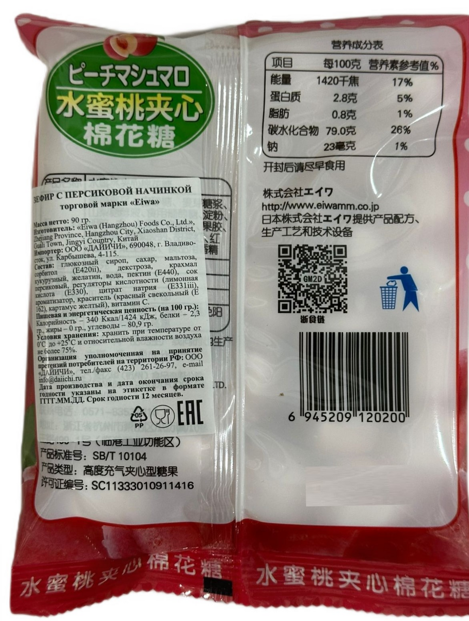 Зефир Eiwa персиковая начинка, 90г