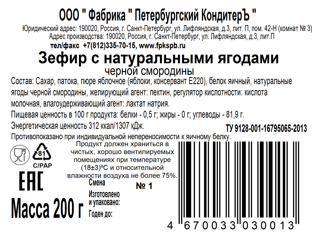 Зефир Петербургский кондитеръ с черной смородиной, 200г