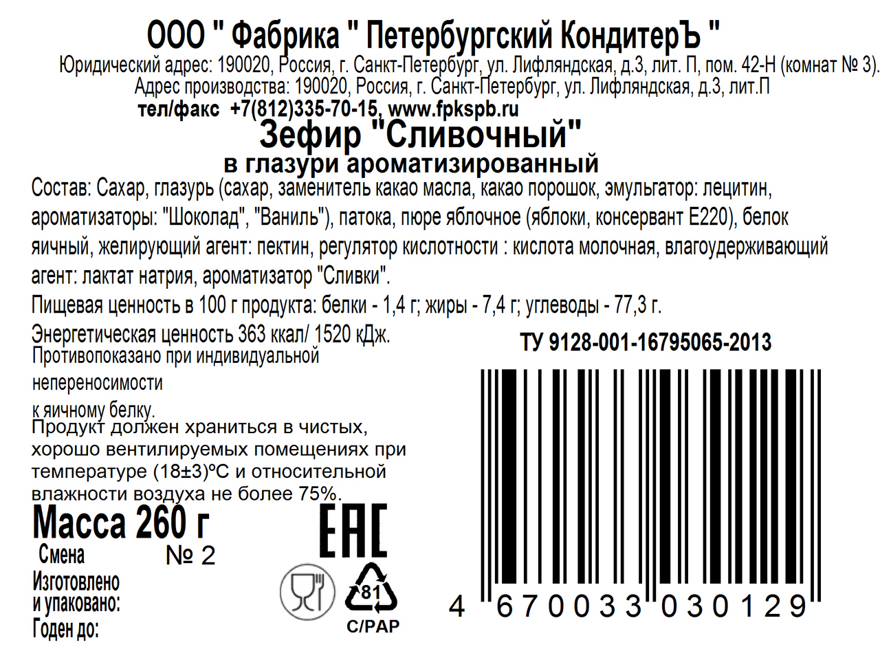 Зефир Петербургский кондитеръ сливочный в глазури, 260г