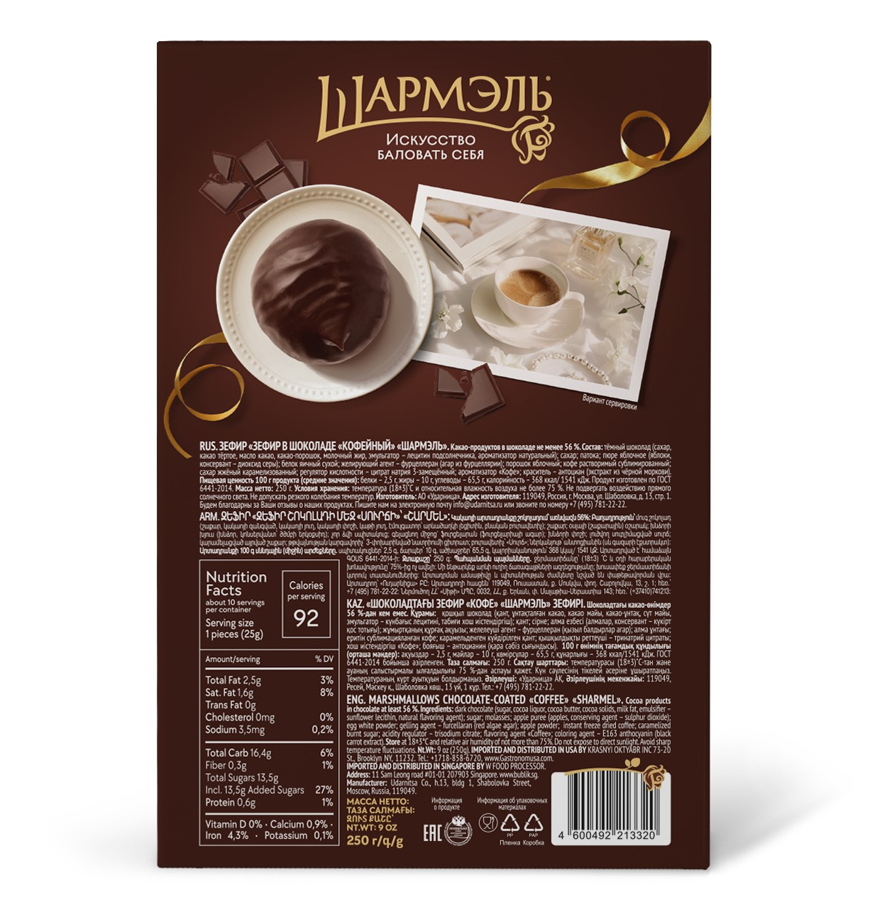 Нежный, воздушный зефир в глазури из великолепного темного шоколада был создан более полувека назад кондитерами московской фабрики Ударница. В основе этого легкого лакомства натуральное яблочное пюре, яичный белок, агар-агар, уникальное полезное вещество, которое получают из морских водорослей. Сливочная гамма вкусов зефира Шармэль прекрасно сочетается с шоколадной глазурью.