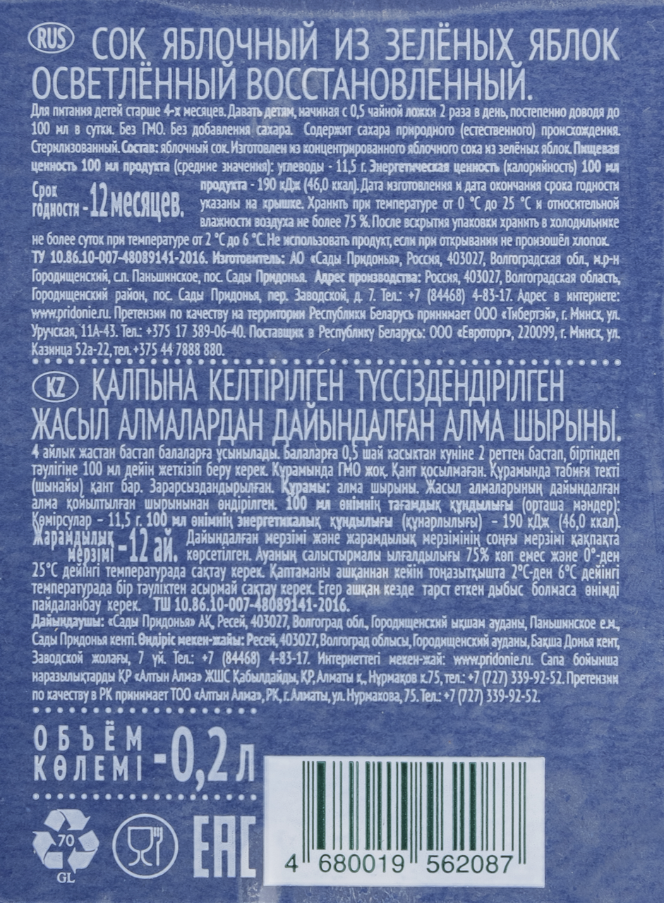 Произведен из концентрированного яблочного сока из зеленых яблок.