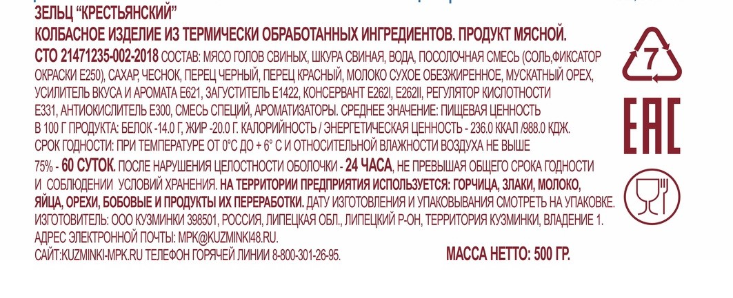 Мясо голов свиных, шкура свиная, вода, посолочная смесь соль, фиксатор окраски е250, регуляторы кислотности е331, е262, антиокислитель e316, усилитель вкуса и аромата e621, стабилизатор е1422, смесь специй, ароматизаторы.