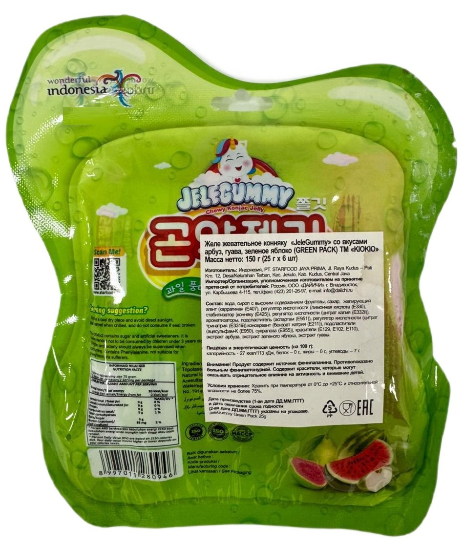 Низкокалорийное лакомство с приятной жевательной текстурой. Конняку (конжак), известный как источник растительных волокон и природный загуститель с низкой калорийностью, не только наделяет текстуру десерта однородностью и приятной упругостью, но и делает угощение полезным для фигуры. Вкусы тропического фрукта гуавы и сочного прохладного арбуза дарят удовольствие благодаря легкой экзотической сладости, а зеленое яблоко освежает приятной кислинкой. Такое комбо вкусов понравится и взрослым, и детям. Желе из конжака удобно брать с собой в дорогу, на работу или - оно упаковано в порционные мини-пакетики. Им можно лакомиться охлажденным или использовать как оригинальное украшение для десертов. Без жира и лишнего сахара, оно станет отличной заменой обычным сладостям. Освежающее азиатское лакомство с приятной упругой и жевательной текстурой и сочным фруктовым вкусом. Низкокалорийный десерт, приготовленный на основе растительного компонента - порошка конжака, идеально подходит для легкого перекуса или сладкой паузы в любое время дня.