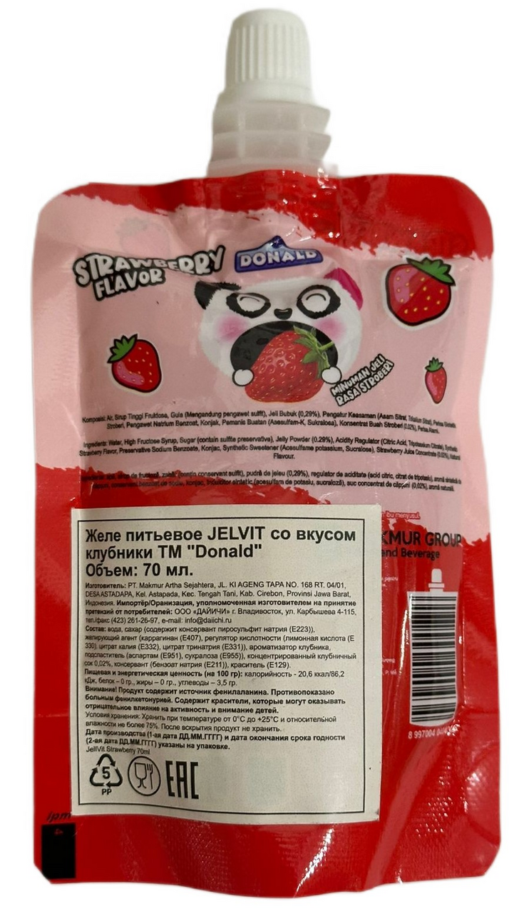 Очень нежное клубничное питьевое желе в удобной мягкой упаковке. В линейке желе Jellvit от бренда Donald вы найдёте несколько разных фруктовых вкусов. Продукт станет отличным перекусом или десертом. Упаковку удобно брать с собой в дорогу даже в небольшой сумке, сытный сладкий перекус всегда будет при вас. Содержит всего 20ккал на 100 граммов, потому станет отличной альтернативой более калорийным десертам.