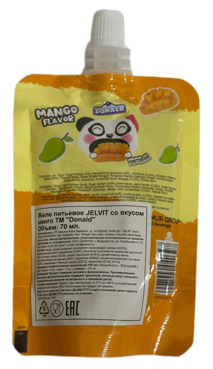 Вода, сахар (содержит консервант пиросульфит натрия (Е223)), желирующий агент (каррагинан (E407), регулятор кислотности (лимонная кислота (Е330), цитрат калия (E332), цитрат тринатрия (Е331)), ароматизатор манго подсластитель (аспартам (Е951), сукралоза (Е955)), концентрированный сок манго 0,02%, консервант (бензоат натрия (E211)), красители (Е102, Е110).