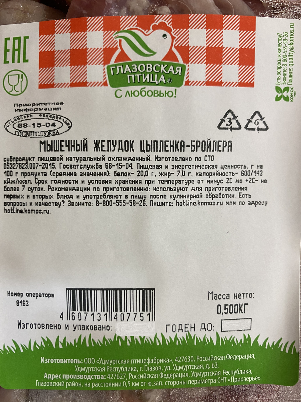 Желудок куриный мышечный Глазовская птица охлажденный, 500г