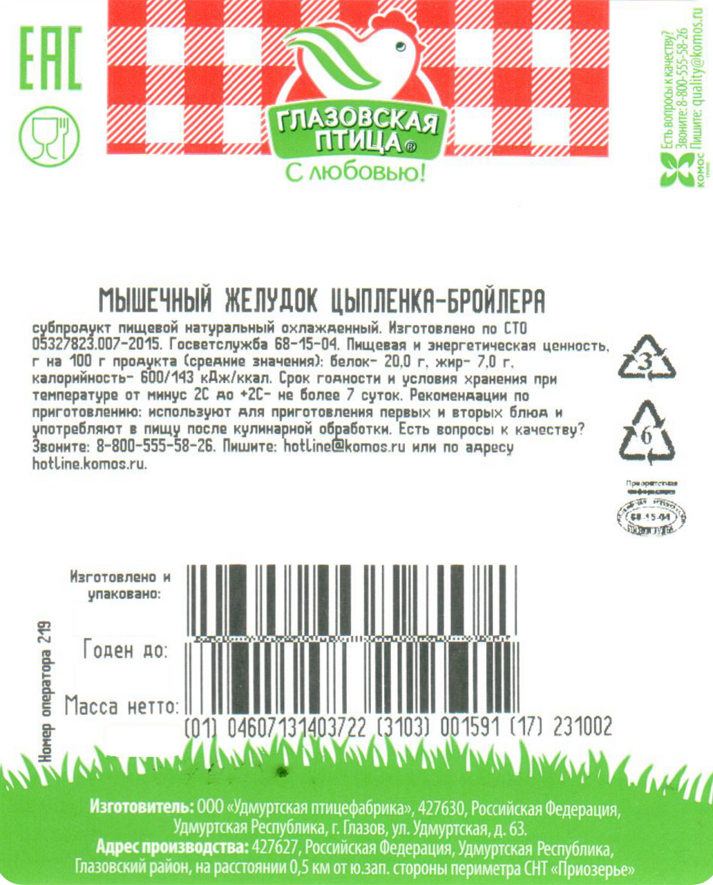 Желудок цыпленка-бройлера мышечный Глазовская птица охлажденный, ~500г