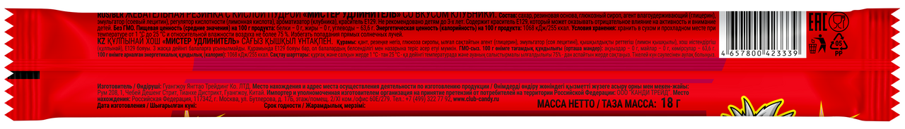 Жевательная резинка Канди клаб Мистер удлинитель клубника, 18г x 30 шт - жевательная резинка огромная с кислой пудрой Мистер удлинитель. Угощение с праздничным оформлением: жвачка в виде палочек, которыми можно украсить стол во время вечеринки. В упаковке сразу 30шт, чего хватит для большой компании. Угощение для утренников в детских садах, во время школьных мероприятий, при праздновании 23 февраля, 8 марта, дней рождения. Каждая жевательная резинка обладает ярким ароматом и насыщенным вкусом клубники, который погружает вас в атмосферу теплых летних дней. Это прекрасное решение для утоления сладкого желания и получения удовольствия. Мистер удлинитель отлично подходит для перекусов во время учебы, работы или активного отдыха.