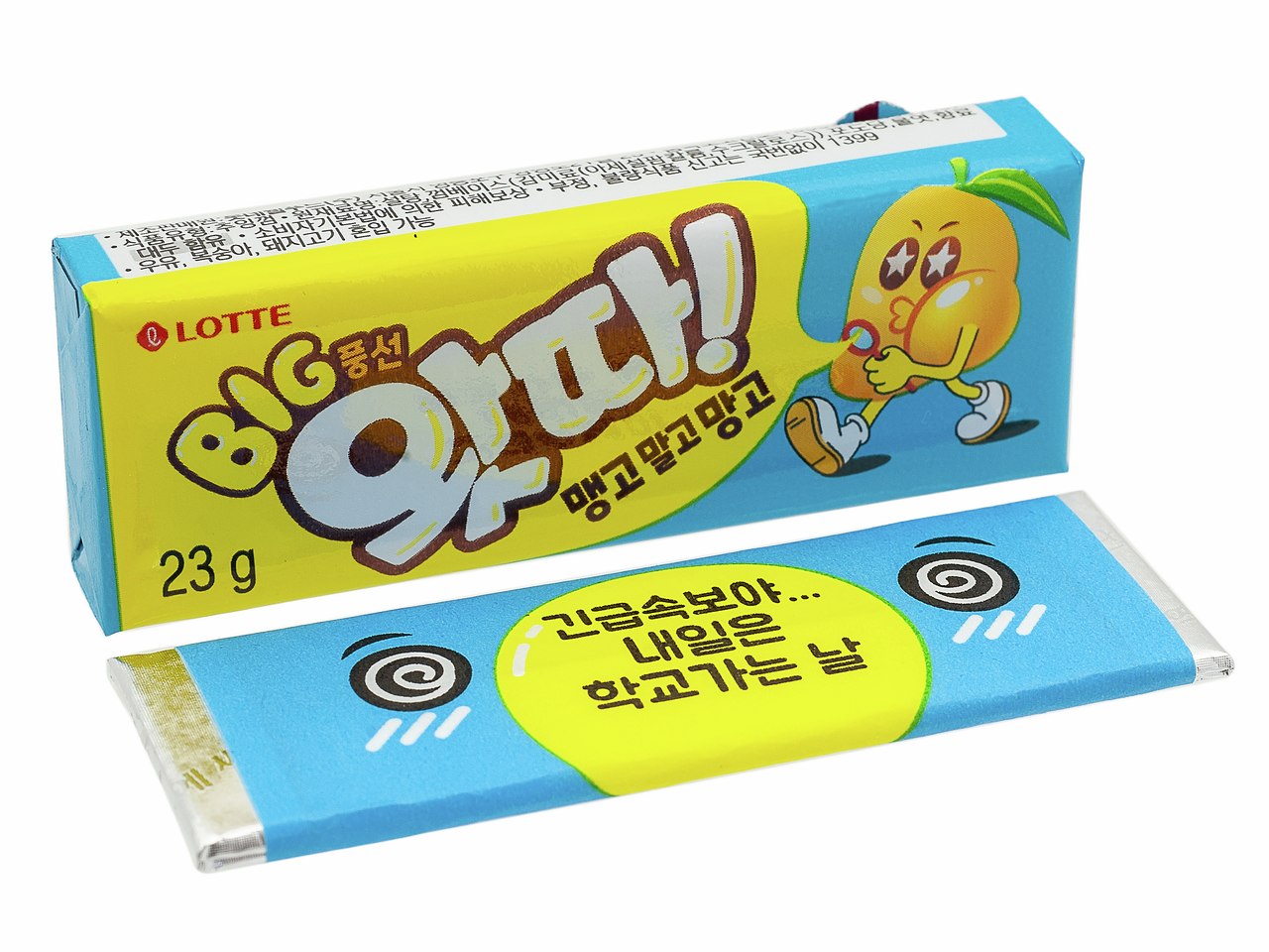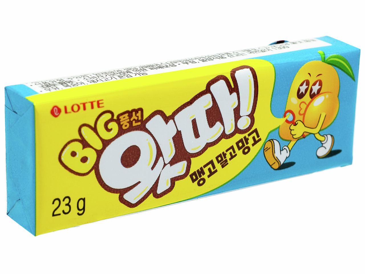 Корейская жевательная резинка с сочным вкусом манго. Мягкая, эластичная структура позволяет надувать очень большие пузыри.