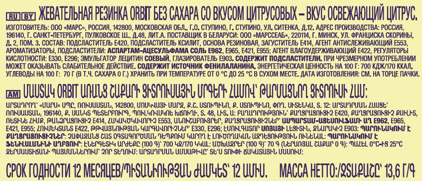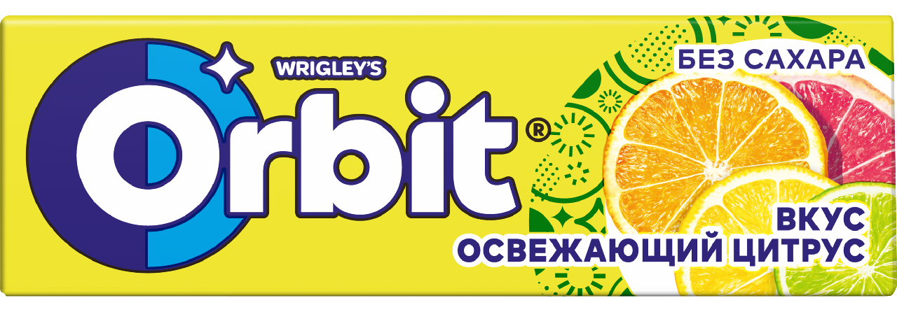 Жевательная резинка Orbit Освежающий цитрус без сахара, 13.6г x 30 шт - жевательная резинка без сахара с ярким фруктовым вкусом. Жевательная резинка помогает заботиться о зубах: удаляет остатки пищи, способствует уменьшению зубного налета, нейтрализует вредные кислоты и усиливает процесс реминерализации эмали. - Orbit Освежающий цитрус освежает мысли и позволяет сконцентрироваться на важных задачах, будь то работа или учеба.- Жевательная резинка Orbit не прилипает к зубам, освежает дыхание и долго сохраняет насыщенный вкус.- В упаковке 10 штук жевательной резинки Orbit Освежающий цитрус. У каждого из нас бывают моменты, когда ты сам не свой и кажется, что все идет не так. Накрутил себя? Завал на работе или учебе? Жуй, когда нужно сконцентрироваться и принять решение. Жуй, чтобы выдохнуть и расслабиться. Способствует поддержанию здоровья зубов: удаляет остатки пищи, способствует уменьшению зубного налета, нейтрализует вредные кислоты, усиливает процесс реминерализации эмали. Употребление жевательной резинки каждый раз после еды способствует поддержанию чистоты и здоровья зубов в дополнение к уходу за ротовой полостью с помощью зубной щетки.